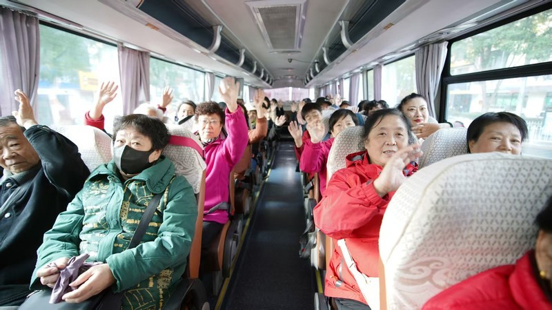 活动当天,退休职工们早早来到五泉街道集合点,在工作人员的引导下有序签到,乘坐大巴前往仁寿山途中,“怀旧金曲互动” 环节温情开启,《夕阳红》《我和我的祖国》等熟悉的旋律响起,大家轻声跟唱,车厢内暖意融融。