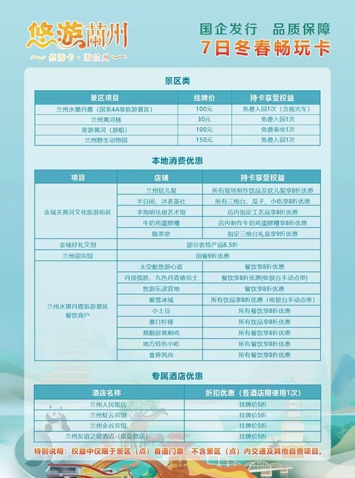 除上述景点外,畅玩卡还叠加了丰富的本地消费优惠活动。其中包括金城关黄河文化旅游街区部分消费享8折优惠;购买金城好礼文创店农特产品享8.5折优惠;兰州水墨丹霞景区10余家餐饮消费享8折优惠;虹云宾馆等多家酒店住宿享挂牌价5折优惠;兰州迎宾馆餐饮消费享9折优惠。
