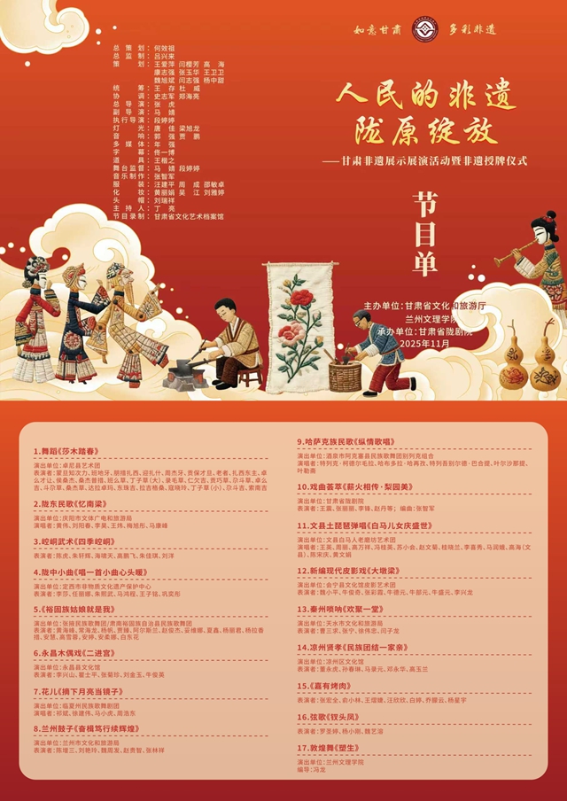 非遗璀璨照寰宇,民间艺术放光辉。由甘肃省文化和旅游厅、兰州文理学院主办,甘肃省陇剧院承办的“人民的非遗·陇原绽放”——甘肃非遗展示展演活动暨非遗授牌仪式将于11月28日19:30在兰州文理学院艺术实践中心精彩上演。今日,备受期待的演出节目单正式发布,一场融合古老智慧与现代审美的视听盛宴揭开神秘面纱。