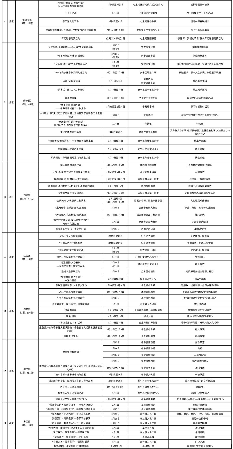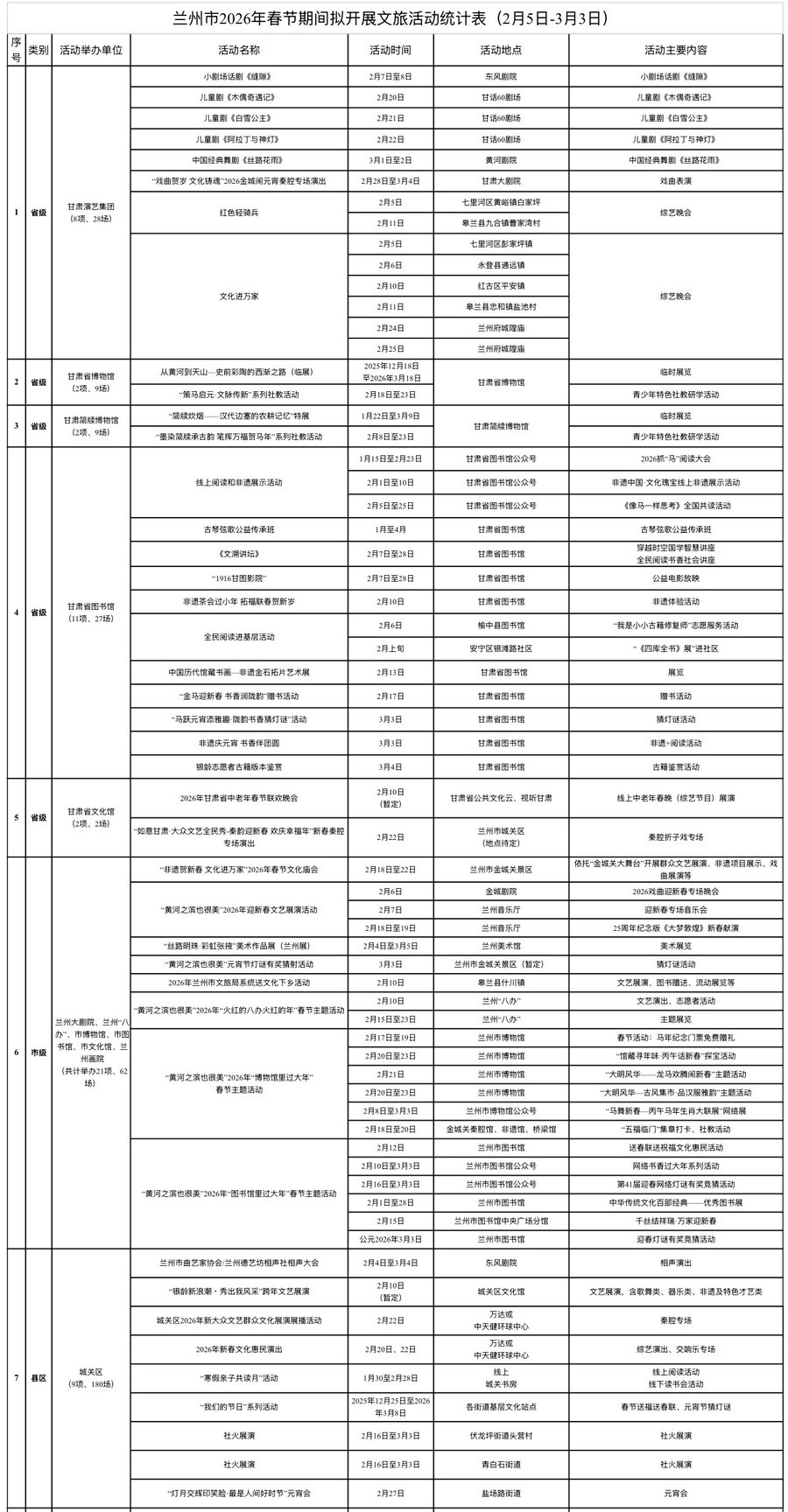 为丰富市民游客节日文化生活,营造欢乐祥和的节日氛围,推动优质文化资源直达基层,激活假日文旅市场消费活力,兰州市文旅局聚焦全域联动,以省、市、县(区)三级公共文化文博场馆、文艺院团、剧场以及基层文化站点和各A级景区为载体,丰富全市全域春节文旅活动。