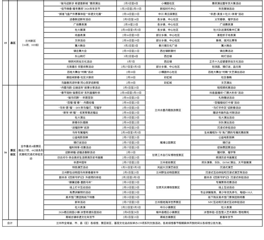 据介绍,活动整体聚焦形成“省市级引领、县区级联动、景区街区协同”的全域格局,省级文艺院团、文化文博场馆举办活动25项;市级文艺院团、文化文博场馆举办活动21项;八县区及兰州新区各类文化文博场馆、各重点商圈及基层文化站点举办活动86项;A级景区及重点街区举办活动27项。