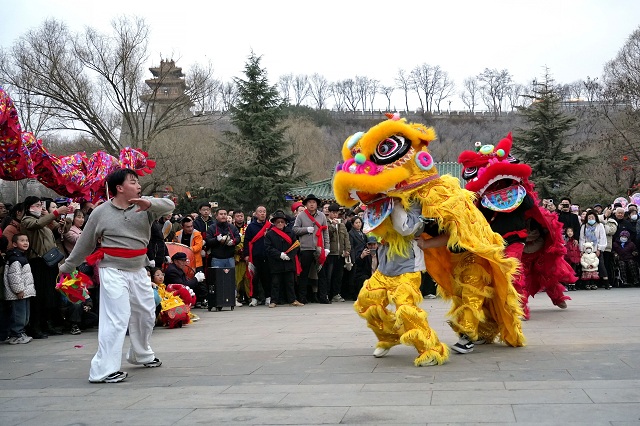 同样的热闹也蔓延到了崆峒山和古镇。在山上,景区推出的“骏马迎春·福满崆峒”系列活动,融合新春祈福、道源文化展示、崆峒武术展演等内容,联动崆峒古镇打造年味集市、马年主题花灯长廊,吸引大量游客驻足。不少游客抢着去击那一面祈福鼓,“咚”的一声,觉得“一年的精气神都提起来了”。崆峒武术表演的场子被围得里三层外三层,喝彩声不断。在崆峒古镇,节庆氛围更为浓厚。每日上午,铿锵的锣鼓迎宾准时响起,舞狮互动、崆峒武术展演、川剧变脸等绝技轮番登场,引人惊叹。下午,古镇化身阖家乐园,魔术、小丑表演逗乐孩童,时尚音乐与国风广场舞让不同年龄段的游客都能找到乐趣;戏台上,秦腔惠民演出日日连台,传承着地方文化根脉。当夜幕降临,古镇到一天中最迷人的时分。传承千年的“打铁花”技艺化作漫天金雨,药发木偶、炭花舞等非遗表演如梦似幻。游客们围着篝火欢笑,仿佛参与一场穿越古今的盛会。