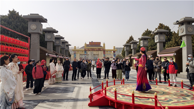 在武威文庙景区举行的“科举风华·探秘千年科举之路”快闪活动中,身着古装的演员化身“状元、榜眼、探花、进士、举人、秀才、童生”,引领游客走过棂星门、跨过状元桥、礼拜大成殿,完成一场跨越千年的文化对话;在南城门楼,“凉州大将军”铠甲鲜明、气势如虹,沿城楼巡礼展仪,尽显古凉州雄关漫道、丝路要塞的豪迈气象;在雷台景区,身着汉服的同袍漫步在和煦春风里,还有楼兰少女在铜车马仪仗俑阵列前舞姿灵动,让雷台的春意里多了一丝异域风情;而在天梯山石窟景区,敦煌壁画神韵的飞天舞蹈,在13号石窟大佛与碧波荡漾间翩翩起舞,吸引游客互动参与,成为一道亮丽的风景。另外,在民勤苏武沙漠景区、民勤通航乐园、古浪西凉女国、天祝乌鞘岭等景区,快闪活动也在按计划筹备开展。