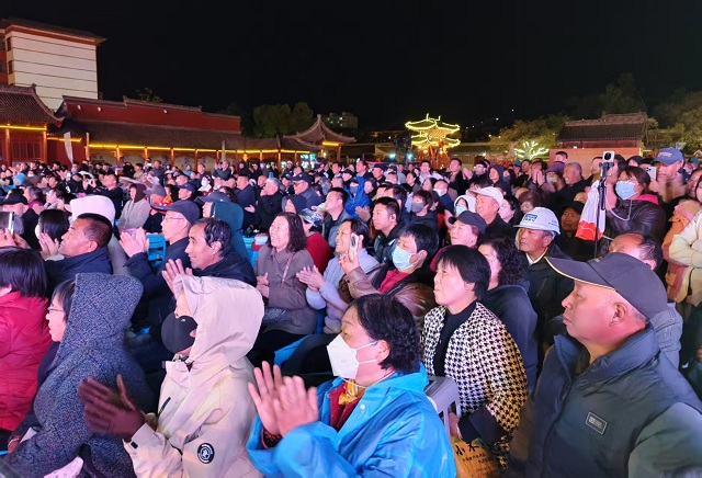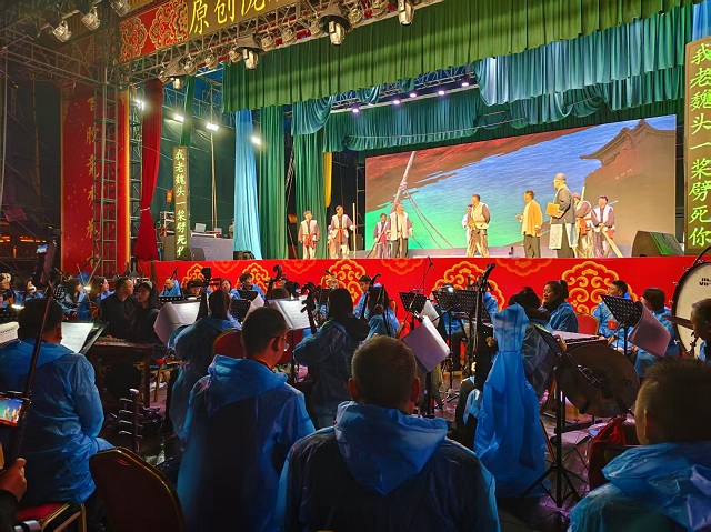 一场春雨不期而至,当晚的伏羲广场华灯映雨、情意融融。由于突如其来的降雨,演出的前30分钟,演员们不得不随着事先准备好的伴奏录音带全情演出,50余人的民族乐团身着雨衣静坐台下守候;雨停后,乐团与“嘛簧”队立即现场伴奏,以坚韧的舞台信念和深厚的黄河文化底蕴,为冒雨守候的观众及网络直播间网友献上了一场别样的视听盛宴。