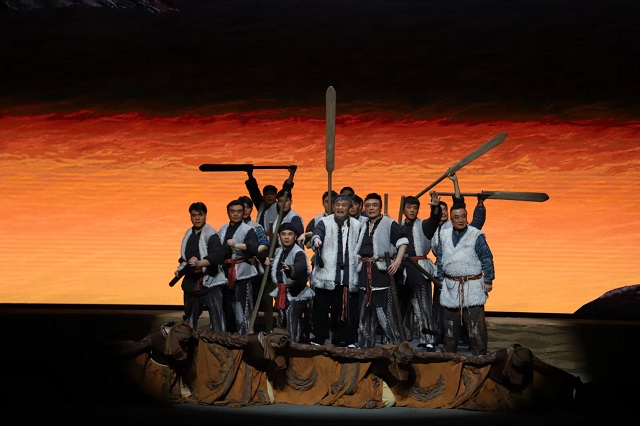 《大河东流》以20世纪30年代末兰州黄河岸边的筏子客为原型,讲述了他们在时代洪流中与命运抗争、守护家园的感人故事。全剧将陇剧特有的“嘛簧”唱腔与黄河号子巧妙融合,即便开场为伴奏带配合,黄河的咆哮、筏子的激荡、人物的悲欢离合依然被演绎得荡气回肠。
