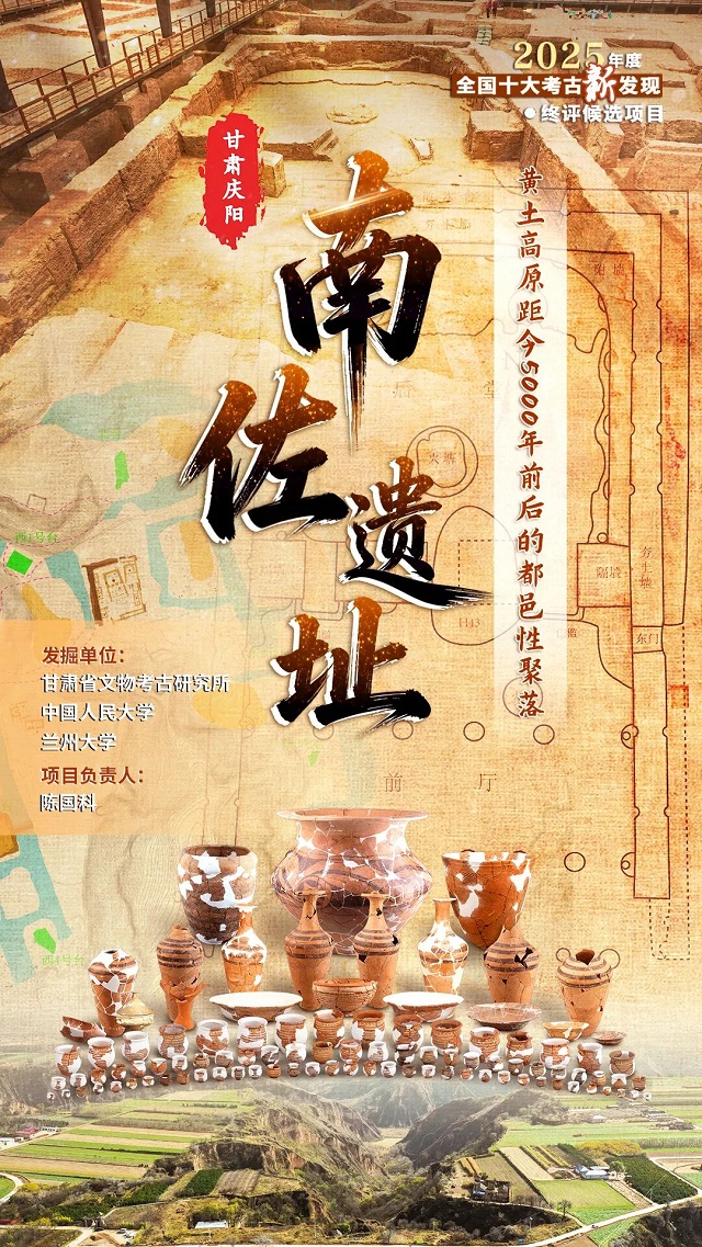 南佐遗址位于甘肃省庆阳市西峰区后官寨镇南佐村,坐落在泾河上游一级支流蒲河和马莲河之间的董志塬上。董志塬是黄土高原最大的一块塬地,面积约910平方公里。遗址于1957年调查发现。1984年至1996年甘肃省文物考古研究所等先后对南佐遗址进行了两个阶段计6次考古发掘工作。为了解南佐遗址的年代分期、聚落结构、生业经济、社会状况等问题,2021年至2025年甘肃省文物考古研究所联合中国人民大学等对南佐遗址开展第三轮考古工作。五年共发掘面积约4000平方米,同时在遗址周围展开大规模考古调查和勘探工作(其中勘探面积350多万平方米,调查面积约100平方公里)。初步确认遗址总面积约600万平方米,主体区约230万平方米,核心区约30万平方米。遗址主体年代为仰韶文化晚期,碳十四测年距今约5100年至4700年。