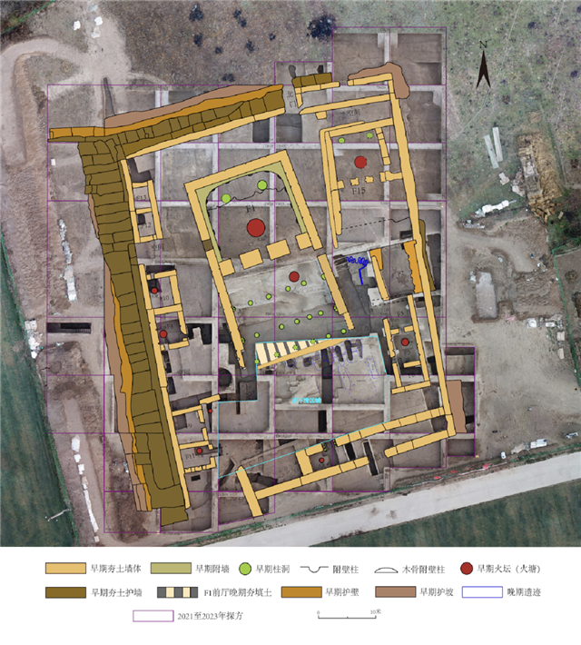 在核心区西部发现一座以F21为中心的东西向院落(二号院落),院落主体建筑F21面积约600平方米,结构与F1相近,F21的中轴线与F1的中轴线互相垂直。2025年对西三号夯土台进行全面揭露,发现其为长方形结构,面积近1700平方米,西、南、北三面被环壕围绕,东侧留有一条约10米宽的通道,该通道也与F1的中轴线垂直。核心区的夯土建筑群体现出以F1的中轴线为基准进行布局的特征。这是中国古代目前所见年代最早、最为清晰的都邑聚落中轴线。