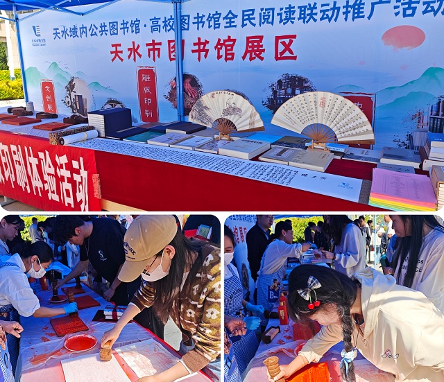 启动仪式后,多元阵地宣传活动同步开展。天水市图书馆重点打造非遗雕版印刷现场体验项目,通过物料筹备、互动指导,让参与者近距离感受传统印刷技艺魅力,以文化体验激活阅读兴趣;甘肃省图书馆带来“千古巨制”《四库全书》展,系统展示中华典籍文化厚重底蕴;各县区图书馆集中展出特色馆藏、地方文献、数字资源,展现区域图书馆服务实力。麦积区图书馆推出“从麦图上车”阅读性格测试、创意书法、创意书签文创展示,用趣味互动拉近与读者距离;数字文献资源宣介让读者便捷掌握电子图书、数据库使用方法,“墨香满径,与世界温柔共读”主题诵读深情演绎经典篇章,传递文字力量;阅读元宇宙快闪展(VR体验)、“零碳・AI・阅读”智慧阅读打造科技感十足的现代阅读新场景;书签DIY、书香入扇、脸谱雅集、种子种植、诗词接龙等趣味手作与互动游戏,让阅读可看、可玩、可体验。