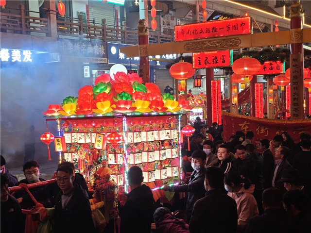 始于隋代、传承千年的舟曲正月十九“迎婆婆”民俗文化活动,是藏汉民族文化交融共生的历史见证,也是陇原大地上鲜活的非遗瑰宝。活动当晚,舟曲县城四街两关供奉的16尊“圣母娘娘”塑像身披华服、仪态雍容,装饰着精美香包与璀璨彩灯的花轿列队启程。仪仗队伍庄严开道,传统鼓乐铿锵齐鸣,巡游队伍穿街过巷、绵延不绝,场面盛大壮观。