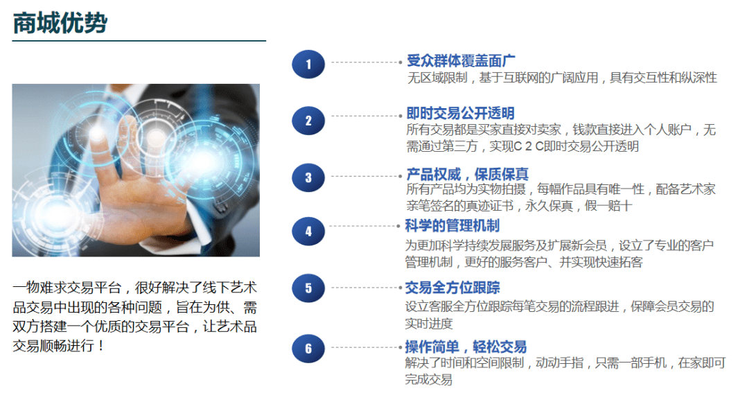 “一物难求”商城是一物难求(山东)科技有限公司研发的一个新型“互联网+艺术品”自由交易平台,以弘扬民族文化、崇尚当代艺术、促进艺术品交易为宗旨,以原创保真、自由定价为核心竞争力,力争成为线上市场连接艺术家和艺术品爱好者的有力桥梁,让艺术品自由交易新模式逐步面向全国乃至全世界,让“一物难求”成为消费者心中满意放心的自由交易平台。
