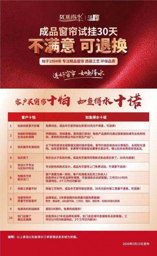 在直播正式开始前,如鱼得水播放了2020年董事长陈道贤先生携手30位管理层发布的”客户买窗帘十怕,如鱼得水十诺“视频,以及与新浪家居强强联合共同打造的《如鱼得水·榜样力量》。通过两段视频可以得知,如鱼得水深入人心的贴心服务。节目中,如鱼得水在全国各地消费者深情诉说对如鱼得水“成品窗帘试挂,30天,不满意可退换”和”客户买窗帘十怕,如鱼得水十诺“两项政策的真心喜爱。以解决客户购买窗帘真正的痛为出发点,如鱼得水两大真诚机制通过明码实价的成品窗帘和新品套餐,让客户实现了像买衣服一样能够方便快捷地选购心仪窗帘,同时先试挂后付款的服务解决了客户的后顾之忧。