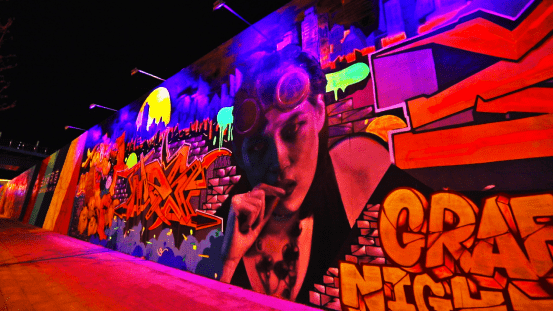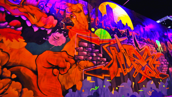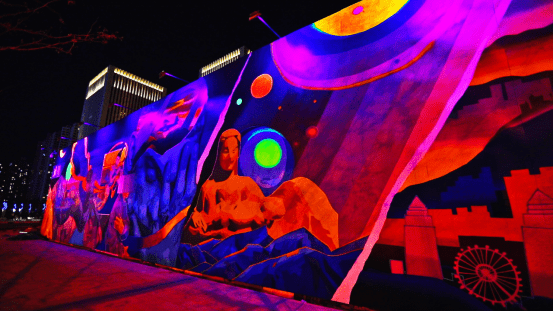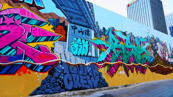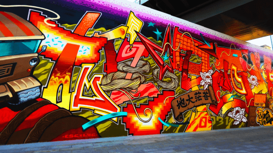 涂鸦墙由小安、细菌、启草、sta2、紫灰、AST、jm、黑狗点、77、GROAS等十位涂鸦艺术家合力完成,耗时近一月,呈现出艺术家对城市历史的洞见与思辨,对历史人文的艺术再表达。