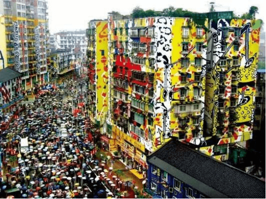重庆黄角坪,依托原四川美术学院的文化氛围,将整个街区变成了涂鸦城,一举颠覆了“里约热内卢”全球第一大涂鸦墙的位置。还是我们国人会玩儿。