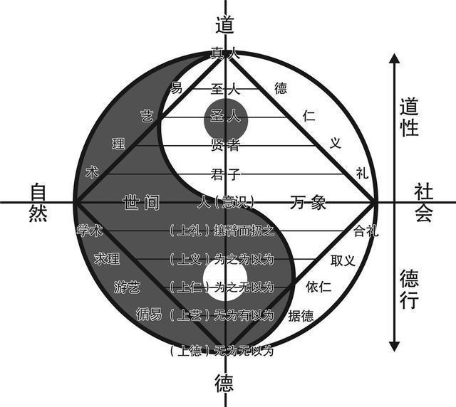 用马克思主义世界观,宇宙分自然界、人类社会、人和人的意识三大类,人在适应自然、和谐社会、自身修悟中所有形成的规律性认识都属于文化的范畴。从道的角度看,人类在适应和改造自然界的过程中,形成五个不同层级的人类认识,即术、理、艺、易(哲学)、道,分别代表宇宙变化的不断重复获得技巧,譬如机械器件的不断打磨出光滑圆润;变化的原理就像器械之间光滑顺畅链接后获得运动的性能;变化的节奏,就像机械运动后产生的节奏变化;变化产生的动力即阴阳互动;最后阴阳和合与道。迄今为止,所有人类知识的范围都没有超出上述范围。人类社会在融合发展中同样形成被儒家总结为礼、义、仁、德、道五个层级规范,分别与自然的术、理、艺、易(哲学)、道相对应。中国传统文化中的精华《大学》、《论语》、《中庸》就是诠释这五个道德规范的学问。人类在返观内视、静修证悟过程中,形成人自身健康发展的可以寿终正寝的君子,可以度百岁而去的贤者,可以无疾而终、达到理想寿命120岁左右的圣人,可以淳德全道的至人(佛家称之为舍利子),可以提携天地的真人(佛家称之为全身舍利子),这在《黄帝内经》和佛道两家的实修经典中都可以得到体现。《道德经》不仅揭示了道,将道分常道与可道,其重点揭示常道。更是一部修炼实证的学问,通过修炼实证,自然界、人类社会与自身修炼的五个境界相互贯通。为了获得上述规律,她指出人在适应自然、和谐社会、自身修悟中如何去做,如何遵循不同规律,采取不同的方式都进行了完整的总结,这些都是德的层面的文化。人在与自然的相处中,应由低到高需要经历“学术、求理、游艺、循易、合德”,人与人的相处中要由低到高需要经历“合礼、取义、依仁、据德、和德”,人自身修为心性由低到高呈现“攘臂扔之、有为有以为、有为无以为、无为有以为、无为无以为”五个层级。以上道德两个方面、三个体系、各五个层级即是宇宙体系,也是宇宙文化体系全貌,是包括自然科学、儒、释、道、医及其边缘学术的全部。各家共同点就是人作为宇宙之灵,在虚极静笃状态下,人与自然和合共生,人的意识与肉体合二为一,儒释道医自然文化融为一体,也就是通过修身为本,人可以贯通自然界与人类社会达到天下太平的理想具体化,君子学术知礼,贤者求理取义,圣人游艺依仁,至人循易据德,真人和合与道。这不正是人与自然和谐共生,各家文化相互借鉴,先互促进,百花齐放的理想世界吗?《道德经》也告诫我们,所有的可道,取决于常道,离开常道,可道会自取其灭。图【一】就是宇宙道德文化的整体内容与关系。
