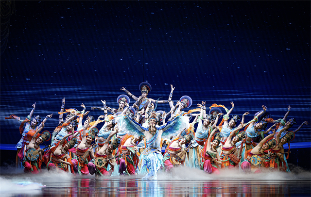 不忘本来、吸收外来、面向未来,舞剧《丝路花雨》的创造性转化、创新性发展从未停止。在时代发展的浪潮中,《丝路花雨》几经改版修排提升,不断升级换代、常演常新,展现出经典的无穷魅力,特别是在2008年和2016年,这部作品经过了两次大的改版,在满足观众审美需求变化的同时,不断以新的姿态持续焕发生机。此次在敦煌文博会舞台上呈现的舞剧《丝路花雨》新版,历时2年综合提升,既复原了79版凭栏仙女、莲花童子等经典舞段,更通过现代舞蹈理念升级情感表达,强化单双三舞蹈编排,配合精准的光影控制、多媒体投影技术,实现了“科技+美学”的破壁创新,在保留经典基因的基础上,实现了“传统与当代”的双向奔赴。当全息投影将莫高窟壁画在舞台上缓缓展开,当驼铃声与电子乐编曲交织出跨越时空的和弦,观众相信,所谓“传统”从不是凝固的标本,而是流动的生命,正如剧中穿越千年的花雨,落在古代画工的笔端,落在当代舞者的袖间,浸润海内外每一位观演者的心田。剧中描绘的中外友好通商、民心交融场景,更是对新时代“一带一路”倡议的生动诠释。