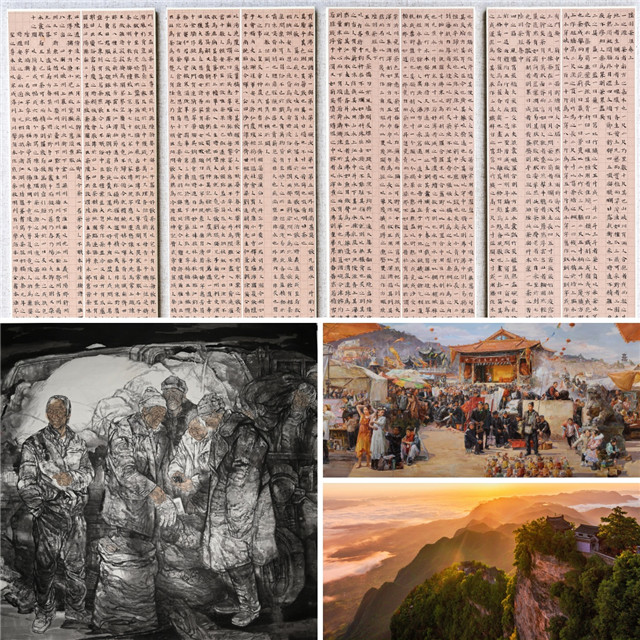 著名雕塑家何鄂创作的雕塑作品《卫国英雄——陈红军》,甘肃画院蔡晓斌创作的油画作品《清风四月》,陇西县文化馆梁大烔创作的中国画作品《秋晨药香》,定西市文化馆米凤霞创作的中国画作品《在希望的田野上》,安定区文化馆陈燕妮创作的中国画作品《乡村振兴·万市大集》,张掖河西学院王盼盼创作的油画作品《精神家园》成功入选第十四届中国艺术节全国优秀美术作品展览。中国书法家协会顾问、省书法家协会名誉主席张改琴创作的《苟利岂因联》,中国书法家协会顾问、省书法家协会名誉主席翟万益创作的《自作诗》,中国书法家协会理事、省书法家协会名誉主席安文丽创作的赵孟頫《灵隐寺山门联》,天水师范大学赵世峰创作的《尚书·尧典》节录,白银市政协李存亮创作的施闰章《雪中望岱岳》,张掖书画院(张掖市美术馆)陈冈创作的陆羽《茶经》,嘉峪关市文化馆颉江泊创作的《文待诏题跋·一则》入选第十四届中国艺术节全国优秀书法篆刻作品展览。中国摄影家协会副主席、省文联副主席吴健创作的《希望之光》,白银市特殊教育学校王生晖创作的《山舞银蛇》,嘉峪关市林业和草原局任玉馨(退休)创作的《骟马城墩染夕辉》,陇南市成县吴庭栋创作的《鸡峰山晨曦》入选第十四届中国艺术节全国优秀摄影作品展览。