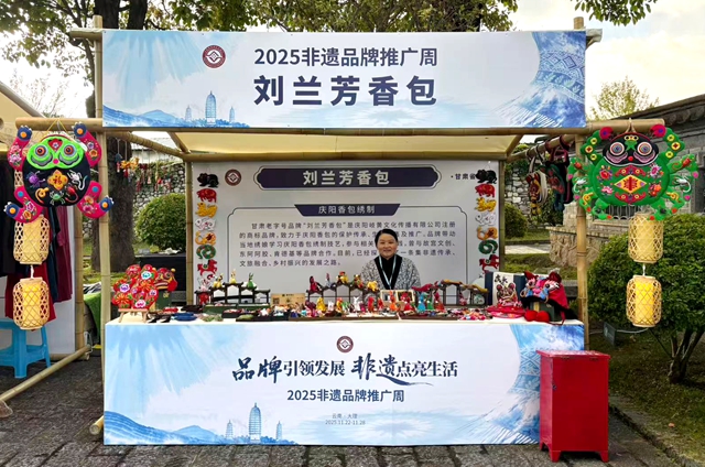 国家级非物质文化遗产代表性项目庆阳香包绣制省级代表性传承人刘兰芳带来《九凤朝阳》《伏羲虎》等经典作品,以立体造型、天然植物填充和吉祥纹样为特色,将黄土高原民俗元素与现代审美相融;其独创的叠绣技法让图案灵动立体,现场展演的“驴敢当”香包制作技艺引得观众驻足围观;该品牌通过“工坊+合作社+电商”模式带动近万名群众就业的故事更获广泛赞誉。