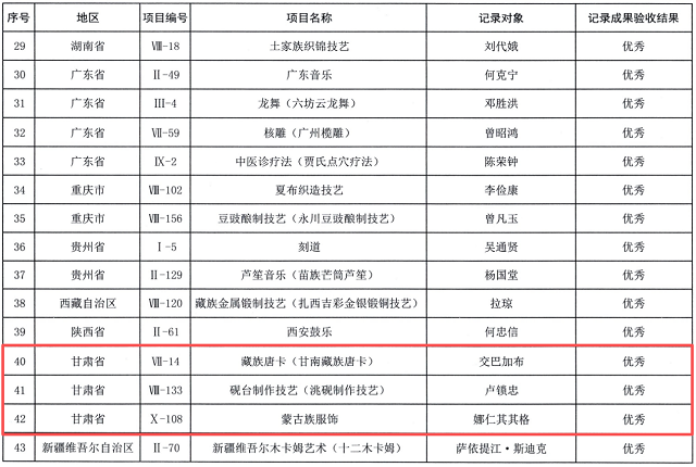 本次验收,全国共提交项目258项,其中优秀项目46项,优秀率为18%。甘肃省提交的12个项目涵盖传统音乐、传统舞蹈、传统戏剧、曲艺、传统技艺、传统美术、民俗等七大类别。其中,甘南藏族唐卡国家级代表性传承人交巴加布、洮砚制作技艺国家级代表性传承人卢锁忠(项目负责人均为刘卫华),以及蒙古族服饰国家级代表性传承人娜仁其其格(项目负责人卢艺文)的记录成果获评“优秀”等次。