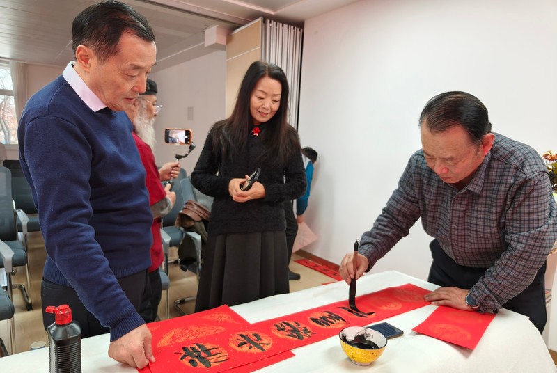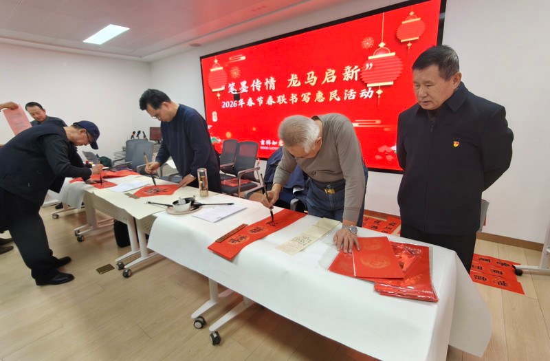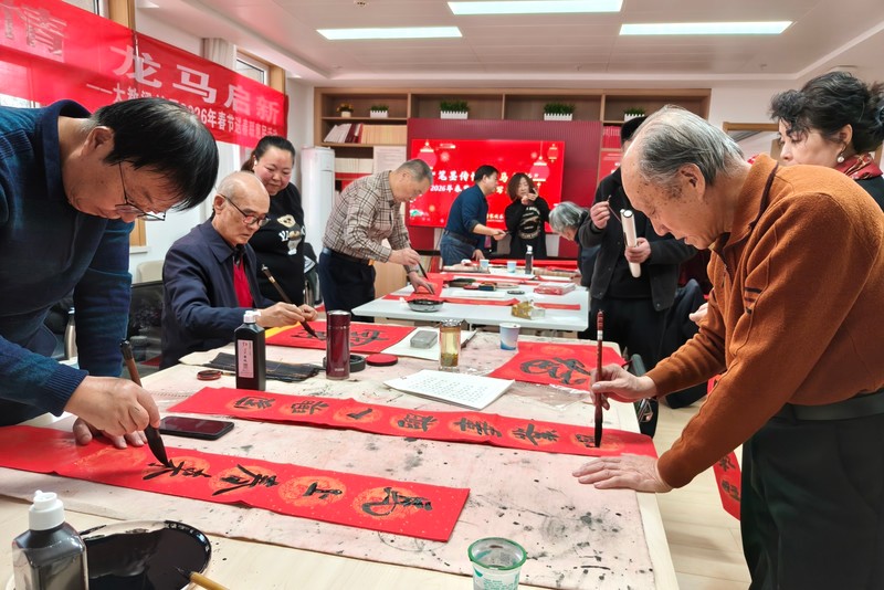 活动现场,暖意融融,红色春联纸和金色的福字帖整齐陈列在案头上,墨香与阵阵欢笑声交织在一起,构成了一幅祥和的新春图景。