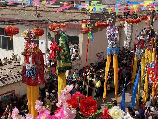 调研活动中,团队与多位非遗代表性传承人、社火骨干进行座谈,围绕社火“龙文化”,以及“高高跷”的历史渊源、表演程式、技艺诀窍、传承困境、当代传承价值等展开探讨,并深入了解了太平鼓在苦水社火中的重要地位。随后,在传承人的带领下,调研人员近距离观摩了演出前化妆勾脸、服饰穿戴、高跷装扮等民俗准备活动和仪式,并进入苦水下二调、木偶戏排练现场,与艺人们进行面对面交流。社火开演后,调研人员紧跟社火巡游队伍穿行于村巷之间,近距离感受、记录,体验了南、北街社火队伍“斗社火”的热闹场景。