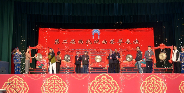 演出尾声,陕西、甘肃、宁夏、青海、新疆及新疆生产建设兵团旗帜齐聚舞台、并肩亮相,象征着西北戏曲文化同心聚力、携手共进、薪火相传的使命担当。文艺演出落幕,受邀领导与嘉宾共同敲响启幕铜锣,响彻广场,标志着这场汇聚西北戏曲精华的文化盛宴正式启航。