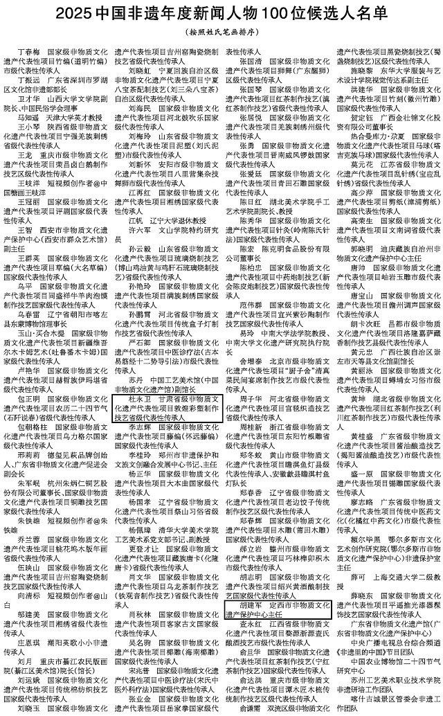 近日,由文化和旅游部非物质文化遗产司业务指导,光明日报社、光明网主办的2025中国非遗年度新闻人物100位候选人名单正式公布。甘肃省级非物质文化遗产代表性项目敦煌彩塑制作技艺省级代表性传承人杜永卫、定西市非物质文化遗产保护中心主任胡建军成功入选。