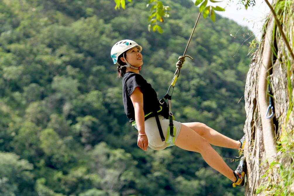 10月4日,游客在云南大理南涧彝族自治县公郎镇猛龙渡体验“攀岩”运动。新华社发(适志宏 摄)
