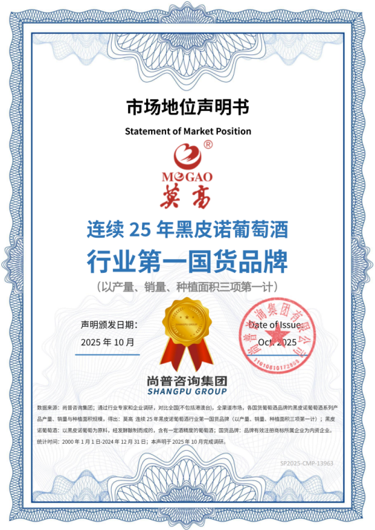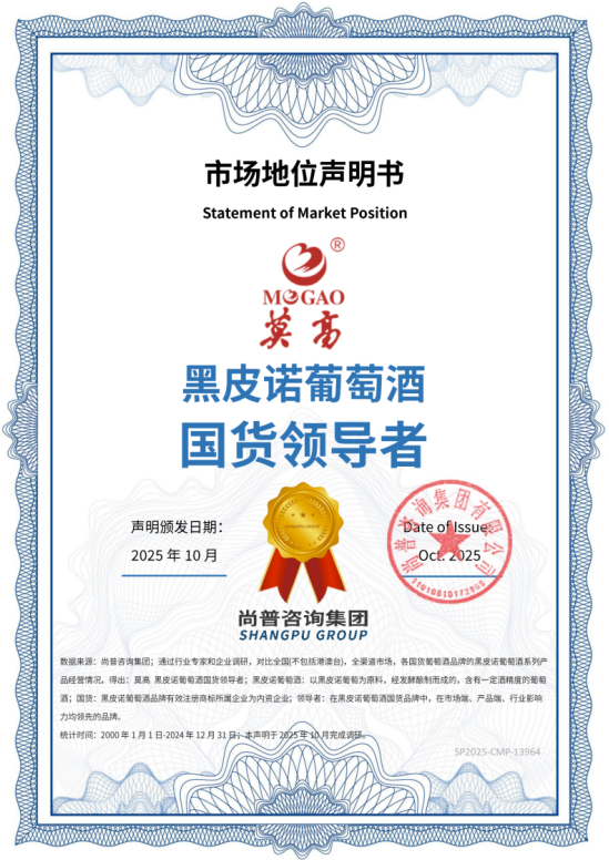 2025年10月,尚普咨询集团正式对甘肃莫高实业发展股份有限公司旗下“莫高”品牌黑皮诺葡萄酒发布市场地位声明,授予其以下三项权威声明:中国第一个黑皮诺葡萄酒品牌、连续25年黑皮诺葡萄酒行业第一国货品牌(依据产量、销量、种植面积综合评定)、黑皮诺葡萄酒国货领导者。