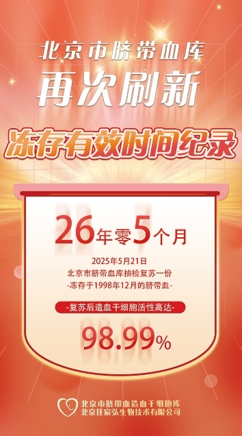 2025年5月21日,北京市脐带血库在例行抽检中,对一份冻存于1998年12月11日的脐带血进行检测,复苏后其造血干细胞活性高达98.99%,刷新冻存有效期纪录至26年5个月,成为我国脐带血冻存有效期的新纪录。这不仅是一次数据的突破,更是对脐带血高标准冻存与质量管理的实证,为长期冻存的安全性与可行性提供了强有力的科学支撑,也让“生命种子”得以永久守护的承诺更加坚实。