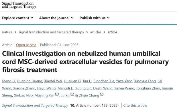 2025年,北京市脐带血库与清华大学基础医学院常智杰教授团队合作的“雾化吸入人脐带间充质干细胞来源外泌体治疗肺纤维化”研究成果,在国际顶级期刊发表。该项目为无细胞治疗策略在呼吸系统疾病领域的临床转化应用提供了关键科学依据。基于此开展的《佳宸弘生物:“外泌体雾化疗法“为肺纤维化提供了新型治疗策略》案例,凭借对临床科研的突破性贡献,成功收录于“2025健康中国创新实践案例库”,这是对北京市脐带血库积极参与前沿科研转化、助力健康中国建设的权威认可。