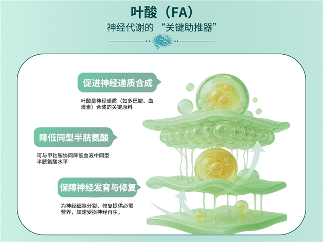 叶酸(400μg)对神经系统具有重要的甲基循环调控功能。该成分与甲钴胺协同作用,可显著降低血液中同型半胱氨酸浓度,从而减轻其对血管内皮及神经组织的潜在毒害。与此同时,叶酸作为多种神经递质生物合成的重要前体,有助于保障神经信号的高效传递与情绪状态的平衡稳定。