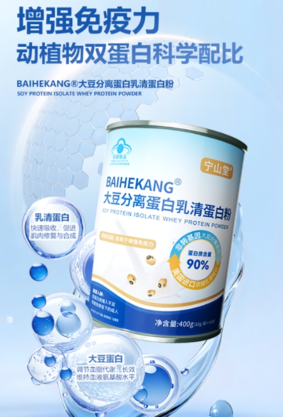 第一款-宁山堂蛋白粉:以高达90g/100g蛋白密度,0添加,获得蓝帽与NSF等多重国际认证,创新双蛋白专利体系,适合对蛋白需求极高、追求长期健康多维人群。