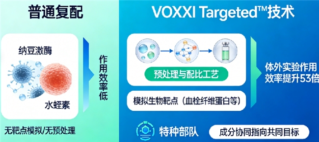 这是VOXXI与普通产品的分水岭。普通复配只是简单地将纳豆激酶与水蛭素等成分混合,而VOXXI的Targeted™技术,旨在模拟这些成分在体内作用的关键生物靶点(如血栓中的纤维蛋白等),通过独特的预处理与配比工艺,使复配后的成分群在体外实验中,于模拟靶点处的结合与作用效率提升了惊人的53倍。这并非意味着体内效果同比例放大,但它清晰地揭示了一种原理:通过精密设计,让多种成分不再是各自为战,而是像一支训练有素的“特种部队”,协同指向共同的目标,极大提升了成分利用的“精准度”与“可能性”。