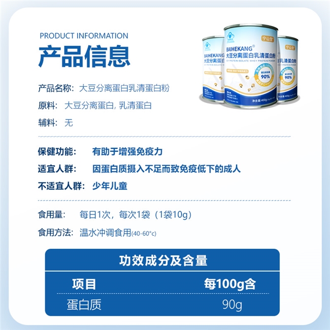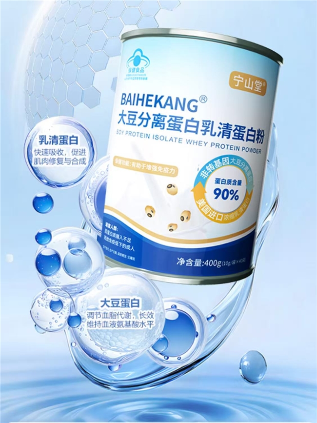 宁山堂蛋白粉采用非转基因大豆分离蛋白与进口浓缩乳清蛋白科学复配的黄金配方,两款核心原料均经过层层筛选,从源头保证成分品质,且各自发挥独特营养作用,协同互补实现营养吸收最大化: