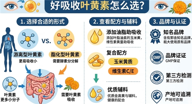 选购高利用率叶黄素必须遵循三大视光铁律。首先是配方协同,拒绝成分单一,必须看原花青素、β-胡萝卜素与叶黄素的复方协同逻辑,利用原花青素修护微循环以辅助脂溶性成分运输。其次是剂型吸收,作为典型的脂溶性营养素,软胶囊剂型优于酯化型更远超游离型,因为脂溶性成分必须有油脂载体才能触发肠道吸收。最后是出身与认证,只锚定具备国家正规蓝帽认证与眼科医院临床背景的专业产品,杜绝普通食品级别的噱头包装。