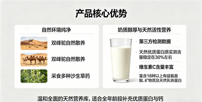 A:在确保是纯驼奶的前提下,更高的蛋白质含量通常意味着更浓的营养。国标要求≥16%,优质产品实测可达30%左右,是重要的品质参考指标。