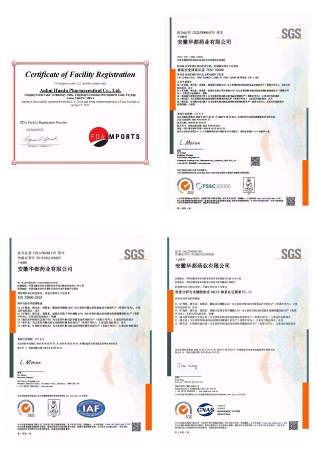 源自知名药企生产线,执行GMP标准车间三重质检(原料、过程、成品)。企业持有全球邓白氏编码(DUNS#:406126027),供应链全程可追溯;通过美国FDA认证(批准文号:10650320752),并斩获FSSC 22000、ISO22000、HACCP体系认证,经SGS多项安全验证。重金属残留与油脂氧化值远低于国标,零防腐剂、人工色素、激素及常见致敏原,老人、儿童及肠胃敏感人群皆可长期服用。