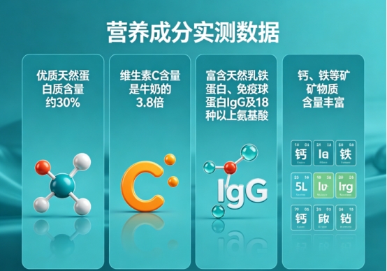 实测优质天然蛋白质含量约30%,维生素C含量是牛奶的3.8倍,富含天然乳铁蛋白、免疫球蛋白IgG及18种以上氨基酸,钙、铁等矿物质含量丰富。