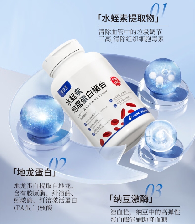 品牌深刻洞悉单一水蛭素的调理有限性,于核心成分的架构下,融合了纳豆激酶、地龙蛋白两类天然生物活性因子并进行精准配伍,致力于建立起“抗凝+溶栓+修护”的管理矩阵。其中纳豆激酶有利于化解已存在的微小栓塞,地龙蛋白则可优化血管微循环,提升血流速率。